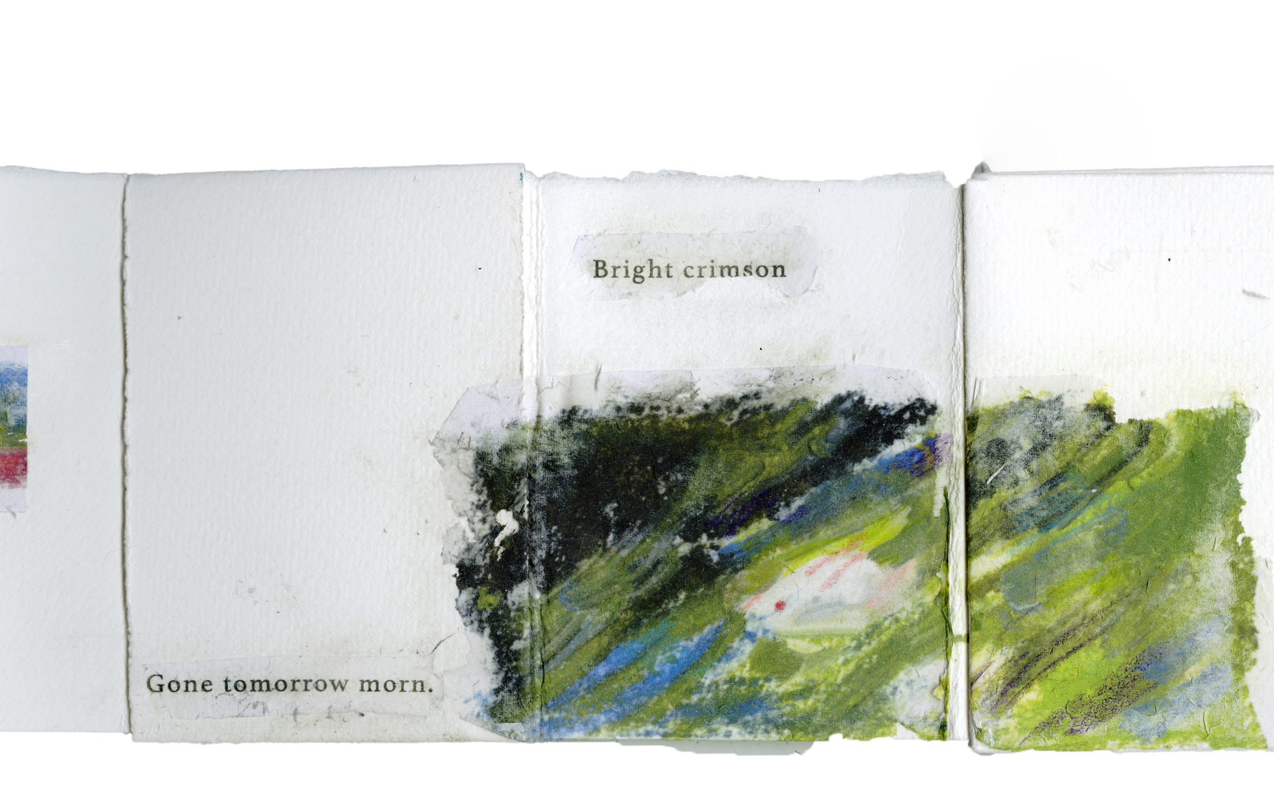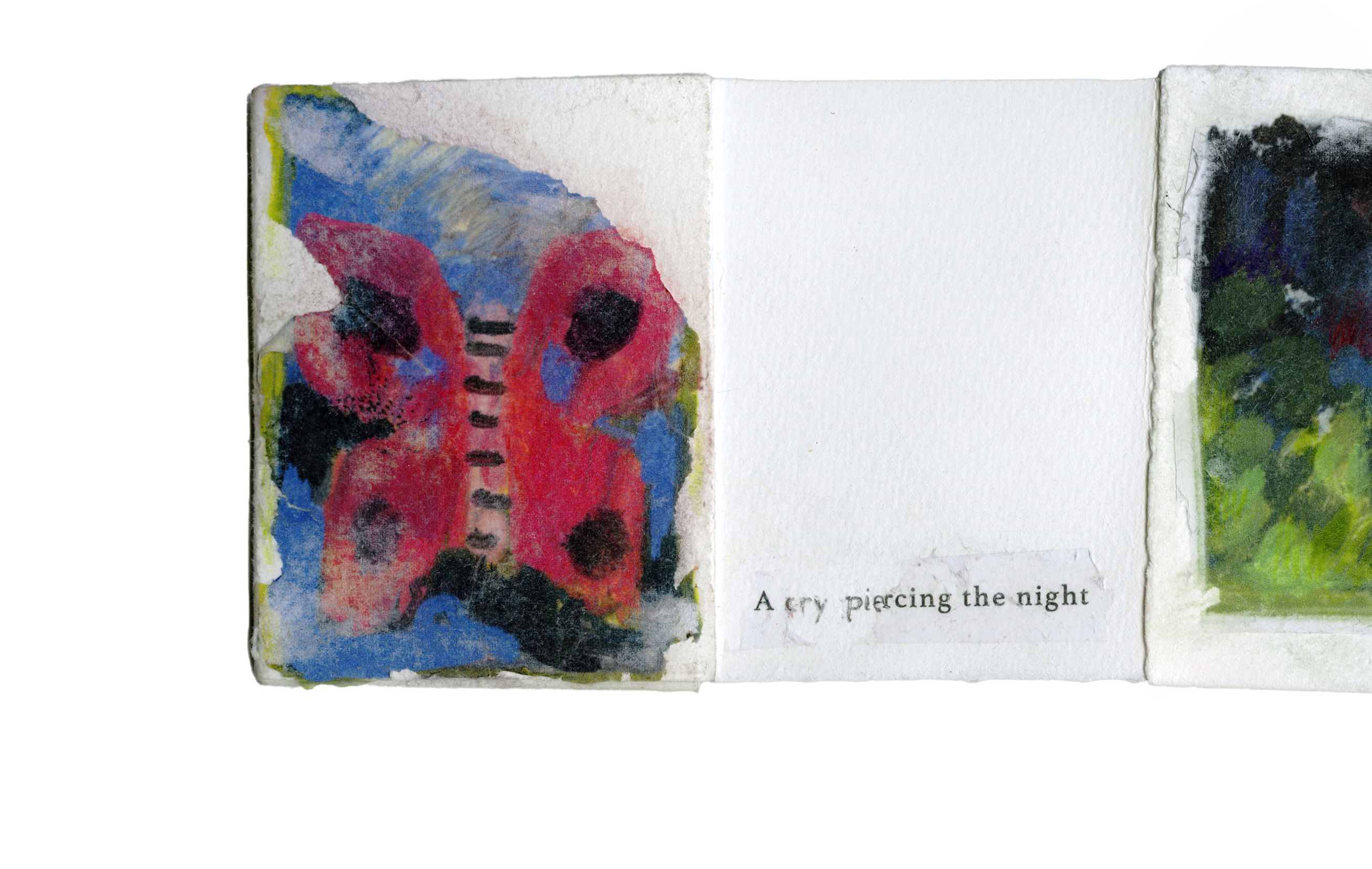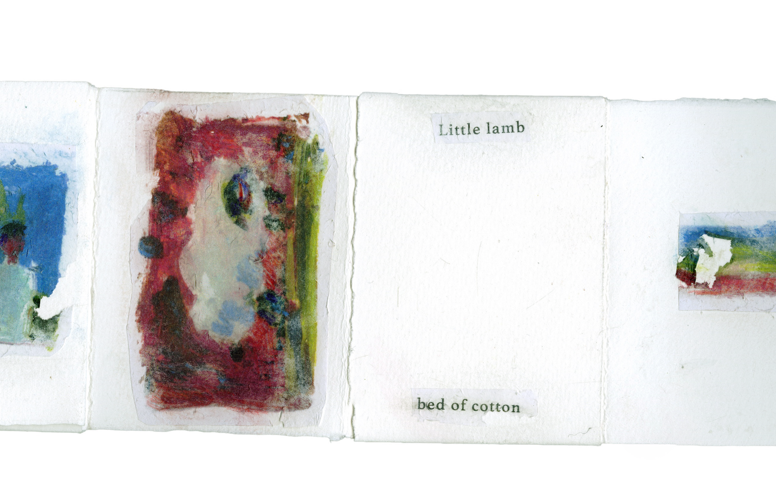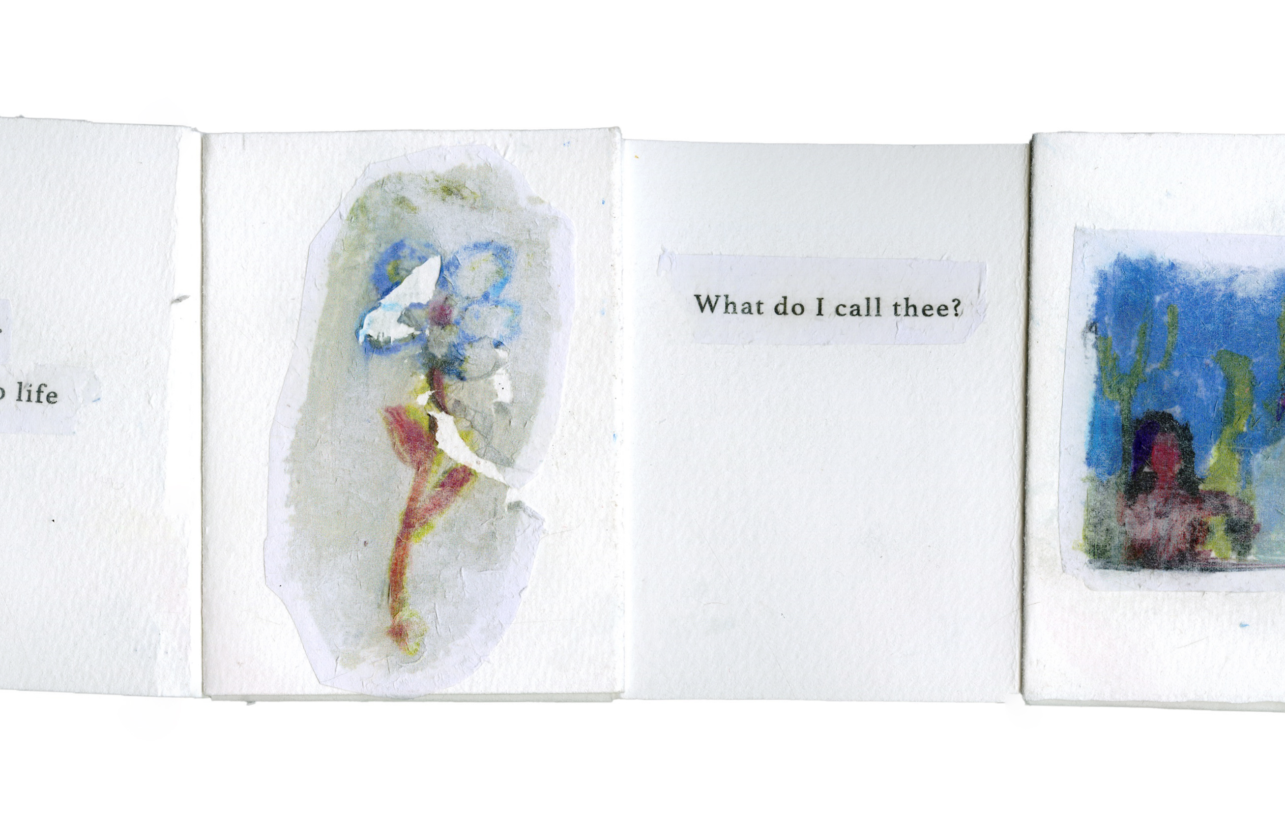 A modular poetry book. Containing three sets of haikus, this accordian book can be pulled apart page by page and reassembled to the readers wishes.